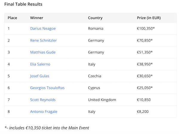 Con questo risultato, Darius Neagoe si è confermato tra i grandi protagonisti delle WSOPE, e soprattutto della scena pokeristica del suo Paese: è il secondo rumeno dopo Alexandru Papazian a avere in bacheca due braccialetti!