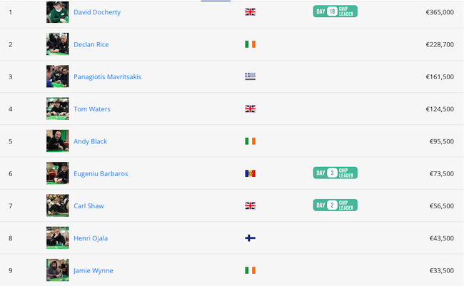 La sfida finale per il titolo ha messo di fronte lo scozzese David Docherty, già tra i final 9 dell’EPT di Londra nel 2022, e l’irlandese Declan Rice. Quest’ultimo, camionista di professione, si è arreso dopo un’ora di gioco al più giovane avversario e si è dovuto accontentare di €228.700. Per il vincitore, arrivato all’Irish Open da un satellite online, la ricompensa è stata di €365.000: si tratta del suo miglior risultato ad oggi, al quale si unisce il prestigioso trofeo.