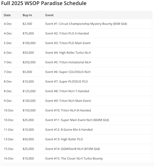 L’appuntamento “tropicale” delle World Series Of Poker propone quest’anno 15 braccialetti tra il 4 e il 16 dicembre. Le WSOP Paradise sono in sostanza la versione High/Super High Roller delle WSOP tradizionali, lo confermano i 13 buy-in a 5-6 cifre. I clou sono: