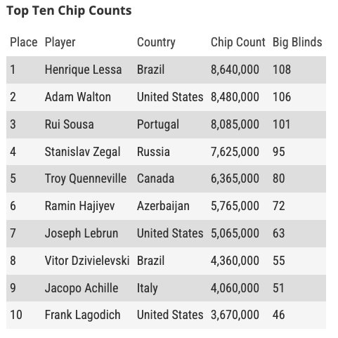 Si profila un Day3 decisivo che Kanit e Achille inizieranno dallo stesso tavolo (il numero 5). Hanno però evitato il chipleader, il brasiliano Henrique Lessa davvero on fire, e i quattro big names rimasti in gioco: David Peters, Timothy Adams, Mikita Badziakouski e Sam Greenwood.
