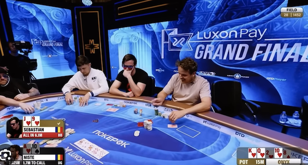 L’azione si svolge durante il $2.200 Luxon Pay Grand Final, disputato a metà maggio 2025 in quel di Cipro. Siamo a 28 left e tra questi c’è il forte pro rumeno Mihai Niste, giocatore da 2,7 milioni di dollari incassati.