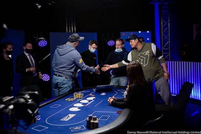 Glowny risale, Alexandridis scende. Il greco uscirà all’inizio del livello successivo. Con bui 200K/400K bb ante il 400K la modalità push-fold prende il sopravvento. Grzegorz Glowny va all-in diretto per 8.350.000. Il greco snappa e lo domina con A♥9♠. Ma la fortuna guarda ancora in direzione del polacco e fa arrivare un clamoroso 8♥ al turn. Symeon Alexandridis è eliminato al 3° posto (€497.278) e il testa-a-testa è servito.