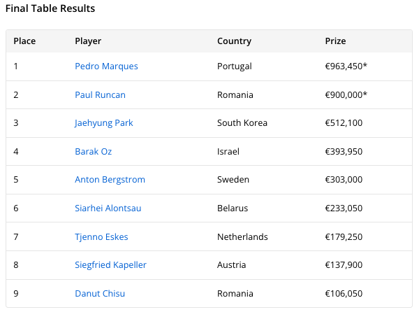Lato economico a parte, non si può fare a meno di sottolineare che alla fine ha vinto il giocatore più affermato. Marques vanta infatti almeno due grandi risultati internazionali ottenuti prima di questo. Nel 2018 è arrivato 4° nell’EPT Main Event di Barcellona; nel 2023 ha chiuso al 5° posto il colossale PSPC organizzato alle Bahamas. Se a questo aggiungiamo altri due titoli EPT vinti in altrettanti side event del tour e svariati piazzamenti itm sia europei che alle WSOP di Las Vegas, non sorprende che Marques sia al secondo posto della All Time Money List lusitana, alle spalle dell’inossidabile Joao Vieira.