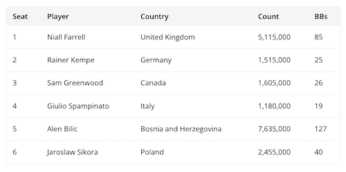 Dopo 5 lunghe giornate nella pokeroom maltese, Niall Farrell approdata al final day 6-handed con il secondo stack. Ha 5.115.000 chips, preceduto dal bosniaco Alen Bilic con 7.635.000. Gli altri quattro sono lontani: