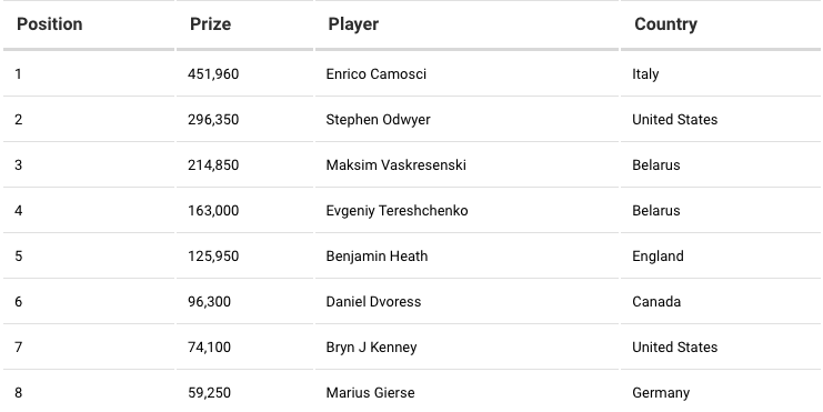 Il più “pesante” è quello conquistato da Enrico Camosci nell’evento #28, uno dei quattro High Roller da 25.000 euro di buy-in. Oltre alla vincita economicamente importante (€452k), “WhatIsLove” (è il nickname online di Camosci) si è imposto su un field di 63 entries, tutte legate a top player. Il payout degli ultimi 8 rende l’idea del livello: