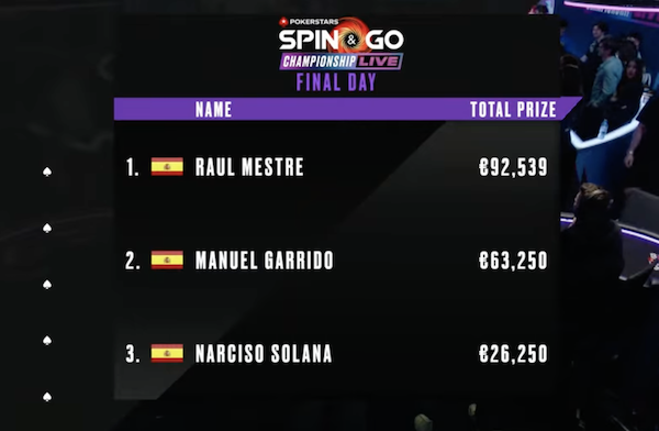 Il testa-a-testa è durato quattro mani. Nell’ultima, Raul Mestre ha centrato colore con J♦9♦ sul flop K♦7♦3♦, contro Q♦8♠ di Manuel Garrido: il resto del board, 4♠Q♥, non chiude il flush draw superiore e mette fine allo Spin&Go Championship di Parigi 2026, con questo payout complessivo: