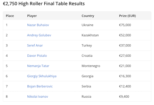 Il tavolo finale è iniziato con il professionista ucraino Nazar Buhaiov (1,6 milioni di dollari accumulati finora) all’inseguimento del chipleader, il kazako Andrey Golubev. Golubev ha inizialmente allungato eliminando Nikolai Ivanov, ma poco dopo Buhaiov ha vinto un coinflip da oltre 45 big blind contro Bojan Berberovic, che ha chiuso settimo. Eliminato anche Giorgiy Skhulukhiya, Buhaiov ha cambiato marcia: ha recuperato terreno, poi ha eliminato Nemanja Tatar e conquistato per la prima volta il chiplead.
