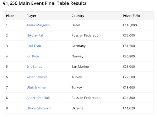 Dopo cinque giornate (Day 1 – Day 5) ai tavoli da poker, il professionista israeliano si è imposto su un field di 414 entry, conquistando il trofeo e una prima moneta pari a €110.000.