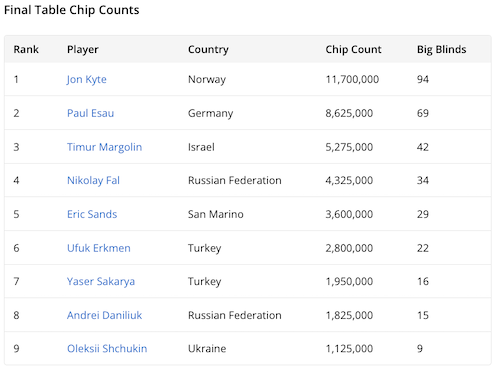 A questo punto, Fal ha preso il controllo del tavolo. Margolin ha però assorbito il colpo. Con un gioco più solido è riuscito a recuperare, soprattutto a scapito di Kyte: un 2-up in coinflip (88 vs AT e board liscio) e poi un big pot pagato fino al river dal norvegese. Accorciatosi, Kyte ha chiuso quarto, eliminato da Nikolay Fal. Paul Esau si è fermato invece al terzo posto, lasciando Fal e Margolin a giocarsi il titolo in heads-up.