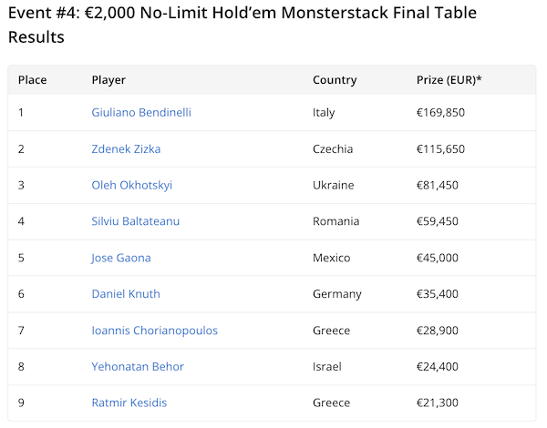 Tra i 96 left c’erano anche tanti altri giocatori del Belpaese, 8 dei quali – oltre a Bendinelli – sono rientrati tra i 63 in the money: Carlo Savinelli (62°), Wissam Ouertani (42°), Michele Tocci (30°), Marco Di Persio (26°), Antonello Ferraiuolo (25°), Marco Bognanni (17°), Giovanni Giudice (16°), Alessio La Francesca (11°).