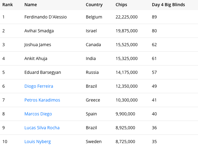 Ad attenderli ci sono tre tavoli interessanti. Anche se l’unico nome noto è quello del pro canadese Parker “Tonkaaaa” Talbot (16° nel chipcount con 6.475.000 chips), ieri abbiamo visto nel field parecchi giocatori di qualità. A partire dal belga di chiare origini italiane Ferdinando D’Alessio attuale chipleader del torneo a quota 22.225.000 chips. D’Alessio è rimasto in controllo per metà giornata fino a quando ha centrato un monster pot contro l’ucraino Vasyl Laba (la trovate scorrendo qui sotto la cronaca della giornata).