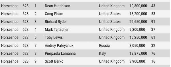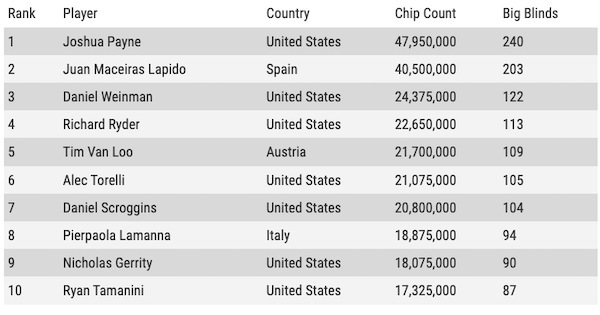 Al comando del chipcount c’è invece lo statunitense Joshua Payne che ha chiuso la giornata imbustando 47.950.000 chips. Queste è la top 10, nella quale spicca l’8° posto di Lamanna.