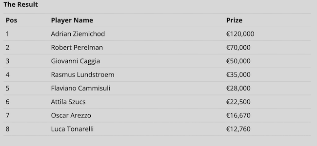 Il 30enne di Cracovia ha così realizzato la sua vincita più alta in carriera, nonché il suo 35mo in the money, incassando 120.000 euro. Si tratta della quarta bandierina piazzata da Ziemichod nei tornei BoM, dopo le tre del 2024, ma senza dubbio è la più importante.