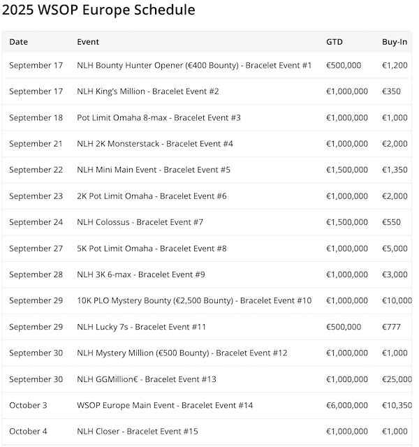La kermesse (17/09-08/10/2025) conta complessivamente 15 tornei principali, cioè quelli che consegnano il famoso braccialetto, per un montepremi complessivo garantito di 20 milioni di euro, il più alto mai registrato alle WSOPE. Oltre a questi, ci sono tutti i giorni satelliti di qualificazione e tornei turbo che iniziano dopo cena.