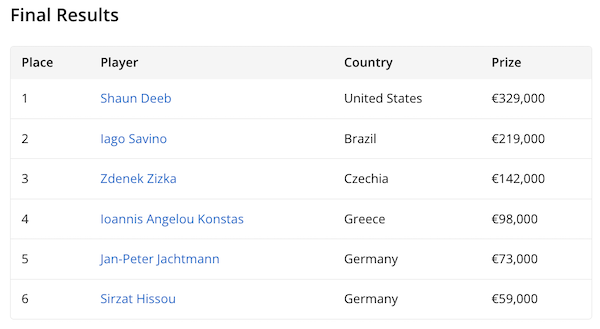 In heads-up contro il brasiliano Iago Savino, Deeb è partito in svantaggio ma ha trovato subito un raddoppio che gli ha consegnato il controllo del match. Da quel momento non ha più mollato, fino a chiudere i conti e incassare i 329.000 euro del primo premio, confermando il suo status di “gigante” del poker mondiale.