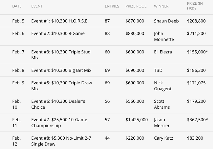 La kermesse è andata in scena a Las Vegas negli studios dell’emittente con un palinsesto di 8 tornei, tutti in modalità varianti multi-gioco. I Mixed Game sono infatti competizioni strutturate in round dove si alternano tipologie diverse di poker.