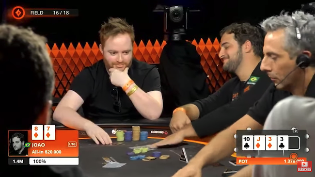 L’azione si sposta al turn che è un 3♣. Un po’ a sorpresa, Farrell decide di rallentare l’azione con un check. Il suo avversario brasiliano ne approfitta e annuncia un all-in da 820.000 chips.