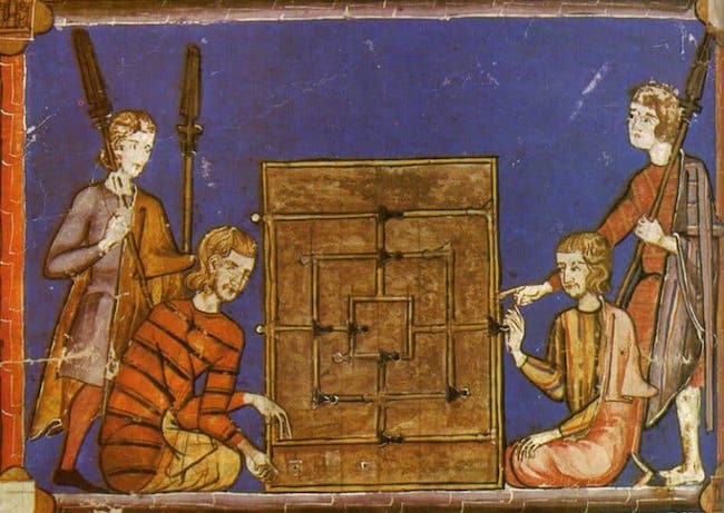 E’ un gioco simile all’odierna dama, dove però le pedine si muovono come la torre degli scacchi: in linea retta di un numero di casella a piacere, sia in avanti che all’indietro.