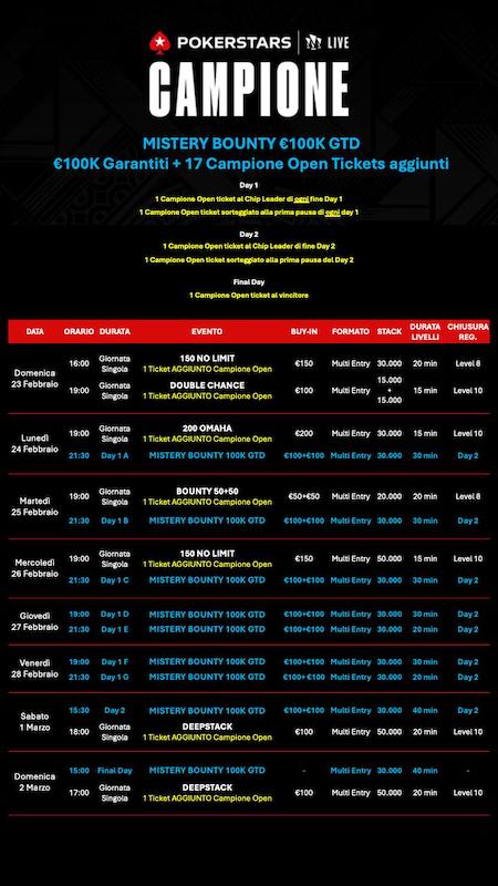 L’organizzazione della kermesse europea, la prima di questo tipo a toccare il suolo italico dopo quasi 9 anni, ha infatti deciso di mettere in palio 17 ticket per il ME, 7 in più rispetto a quanto previsto inizialmente. ll torneo, iniziato ieri, è stato infatti allungato fino a domenica 8 marzo. Lo schema per la distribuzione dei ticket è il seguente. 2 ticket ogni giornata, uno al chipleader finale e uno sorteggiato durante la prima pausa, fino al final day, quando solo il vincitore troverà il pass per il ME.