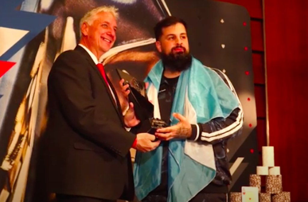 Bartolomeo Tatò si è fatto largo attraverso un field enorme (3.155 entries) nell’arco di tre durissime giornate, fino all’heads-up conclusivo. Ad aspettarlo c’era un giocatore sponsorizzato da una pokeroom, rapper e ora professionista di poker: l’argentino Alejandro “Papo MC” Lococo.