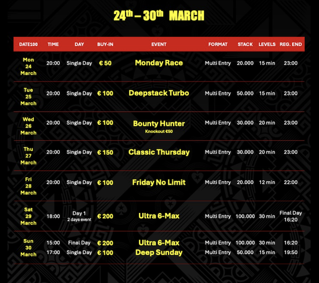 Si comincia oggi alle ore 20:00, con il Monday Race: torneo di TH No Limit da €50 di iscrizione. Nei giorni successivi, fino a venerdì, sarà sempre il Texas Hold’em a tenere banco, proponendo un torneo alle 20:00. I buy-in restano sempre nel range €100/€200. Nel weekend, invece, si inizia a giocare prima e con una struttura più deep rispetto agli altri giorni. Sabato c’è l’Ultra 6-Max (ore 18:00 e final day il giorno successivo), che ha livelli da 30 minuti e consegna ai giocatori uno stack iniziale di 100.000 chips. La domenica offre il Deep Sunday: 15 minuti per livello, 50.000 chips di partenza e inizio alle 17:00.