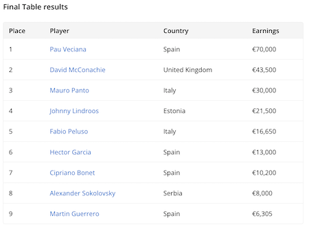 Il colpo di grazia è arrivato da Pau Veciana. Apre l’italiano che poi chiama con J♣7♣ la tribet-shove dello spagnolo che invece mostra K♣Q♠. Il board scorre 6♥6♠4♣A♠9♠ e Veciana, con King high, elimina Mauro Panto al 3° posto (€30.000). Veciana si è imposto anche su McConachie, aggiudicandosi così il torneo.