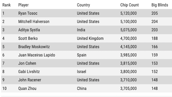 Al comando del count c’è lo statunitense Ryan Tosoc, già vincitore di un braccialetto nel 2018 con l’evento $1.000 No-Limit Hold’em online Championship. Questa è la top 10 alla fine del Day4: