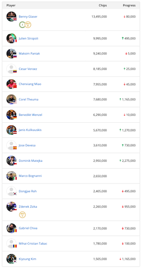 Terzo all’inizio della penultima giornata, il “Magicbox” italiano è riuscito a chiudere il Day 2 all’11° posto con 2.650.000 chip. Un’impresa non semplice considerando il livello del field. Qualche nome? Se ci limitiamo ai last 16, troviamo il fortissimo ceco Zdenek Zizka, vincitore di un titolo WSOP, il pro russo Maxim Panyak, il reg francese Julien Stripoli e soprattutto l’inglese Benny Glaser che vanta 8 braccialetti vinti alle WSOP di Las Vegas. Glaser è anche il chipleader dell’ultima giornata con uno stack pari a 13.495.000.