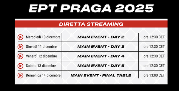 Ricordiamo, infine, che dal 10 al 14 dicembre lo European Poker Tour potrà essere seguito in diretta streaming su PokerStarsnews.it. Il commento tecnico in italiano è affidato alle voci di Giada Fang, Alberto Russo e Pierpaolo Fabretti, con l’aggiunta di numerosi ospiti esperti di poker.