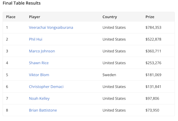 Vongxaiburana ha mandato alle casse sia Marco Johnson (3°) che Phil Hui (runner-up). Blom si è invece fermato al 5° posto, eliminato insieme a Shawn Rice in un mano a tre vinta da Hui con uno scoop, cioè aggiudicandosi sia il pot high che quello low.