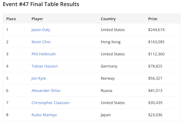 Poker Brat ha raggiunto la fase 3-handed del torneo #47 (3 giornate, 27 entry), poi è stato eliminato da Jason Daly in una mano di Omaha. Daly ha proseguito battendo Kevin Choi in heads-up, per il suo secondo braccialetto in carriera e un premio di $244.674.