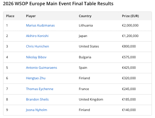 Per Kudzmanas si tratta di un successo storico. E’ infatti il primo giocatore della Lituania a vincere il Main Event WSOPE, risultato che oggi lo colloca accanto a grandi campioni vincitori del torneo come John Juanda (2008), Phil Hellmuth (2012), Adrian Mateos (2013) e Kevin MacPhee (2015). A questo va aggiunta la sua ottima performance in una specialità, i tornei di poker live, che non rappresenta il suo “main game”.