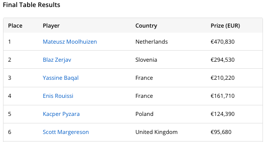 Passano poche mani e il torneo arriva alla conclusione. Mateusz Moolhuizen va all-in diretto da SB/D e riceve il call di Blaz Zerjav che mette gli ultimi 29 milioni in mezzo. Showdown: Moolhuizen A♠7♥ vs K♠Q♦ dello sloveno. L’ultimo board recita 10♥5♥5♦6♥2♥ e consegna colore e titolo a Mateusz Moolhuizen.