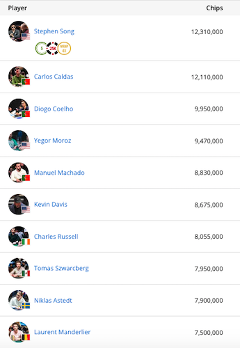 A guidarli c’è nuovamente Stephen Song che con 12.310.000 gettoni colorati ha confermato la chiplead raggiunta nel Day4. Alle sue spalle troviamo due portoghesi, Carlos Caldas e Diogo Coelho, mentre Manuel Machado completa la tripletta lusitana nella top 5 del chipcount. Questa è invece la top 10: