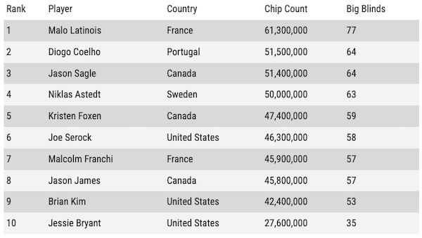 Si sono qualificati al Day8 anche il veterano canadese Jason Sagle e i possessori di un braccialetto WSOP Joe Serock, Brian Kim, Jason James, quest’ultimo fresco di vittoria nell’evento Tag Team.
