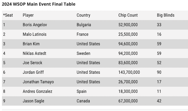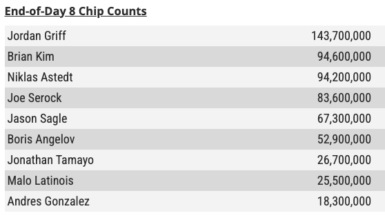L’ultima giornata prima del final table si è conclusa con la chiplead di Jordan Griff. Lo statunitense ha creato letteralmente il vuoto dietro di sè dopo aver imbustato 143.700.000 chips, circa 50 milioni in più degli inseguitori più vicini: il connazionale Brian Kim (94.600.000) e Niklas Astedt (94,2milioni). Molto più distanziati gli altri, come si evince dal chipcount: