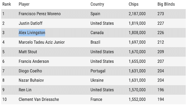 Chi invece non dovrebbe avere problemi a superare il “bubble moment” è Francisco Perez Moreno. Lo spagnolo, specialista di PLO, ha infatti chiuso il Day3 al comando del chipcount con 2.187.000 gettoni, pari a circa 273bb. Al secondo posto troviamo lo statunitense Justin Datloff, seguito dal canadese Alex Livingston, vincitore di un braccialetto WSOP nel 2022 e già 8 volte a premio in questa edizione.