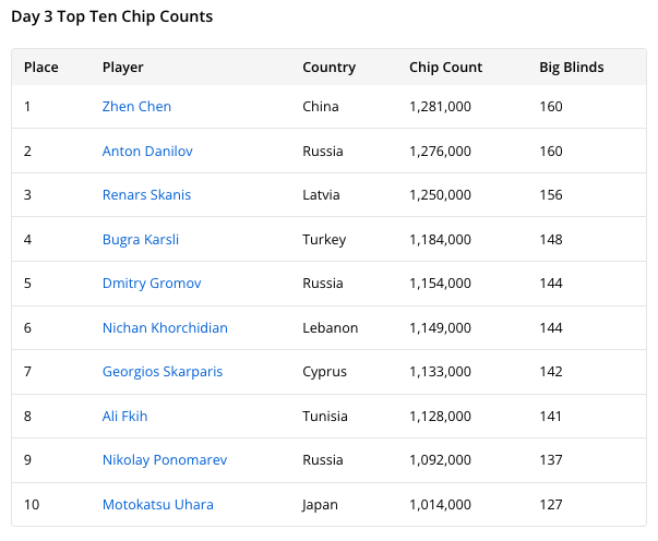 Il passaggio dal Day2 al Day3 ha assottigliato il field da 437 giocatori a 157. Al comando delle operazioni nel Day3 c’è il player cinese Zhen Chen, capace di ammassare 1.281.000 chips, pari a circa 160bb allo start della giornata. Lo tallonano il russo Anton Danilov e il lettone Renars Skanis, rispettivamente con 1.276.000 e 1.250.000 gettoni.