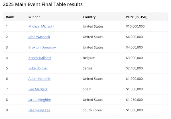 “È incredibile. Dio li benedica tutti… Grazie mille. Penso che sia stato meritato. Non so, non mi dispiaceva aspettare fino all’anno prossimo. Mi motiva ancora di più. Mi fa venire più fame,” ha detto Mizrachi dopo la premiazione. “Sento che (il titolo del Main Event) è stato come un sigillo. Ho sigillato tutto. Tutto ciò che volevo era il Main Event. Ho fatto quello che dovevo fare nel mondo del poker. Ho raggiunto la Hall of Fame. Non andrò mai in pensione, quindi non preoccupatevi di questo. Tornerò l’anno prossimo per molto altro.”