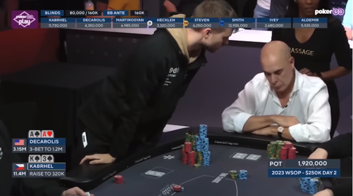 Qualcosa probabilmente scatta nella sua testa e così, dopo l’apertura a 80k di un giocatore da mid-position, Nick Rigby decide di tribettare da bottone fino a 185k con 3♠2♥. John Song gli risponde da SB andando all-in per 655k con A♦K♥. La palla torna all’original raiser che folda, Rigby decide invece di chiamare. A quel punto il call è probabilmente legittimo in termini di rischio, anche perché a carte scoperte è un 35-65%, ma il board K♠6♥4♠6♣8♥ fa perdere al giocatore di Pittsburgh circa il 15% dello stack.