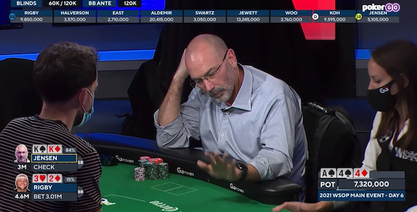 Il bui sono 60k/120 bb ante quando l’ amateur Ronald Jensen (stack 5.105.000) rilancia a 325k da SB con K♠K♦. Rigby (9.850.000) controlla le proprie hole cards e trova 3♥2♦. Inevitabile il raise a 920k. L’action torna al suo avversario che dopo aver riflettuto per un un po’ alza la posta fino a 2,1 milioni. Rigby non resiste e chiama. Il flop A♠4♠4♦ porta l’unica carta che Jensen non avrebbe voluto vedere, un Asso che potenzialmente è nel range di call di Rigby (AK o AQ). L’amateur infatti decide di fare check, Rigby annuncia quasi instant l’all-in e manda in the thank l’avversario. Jensen ci pensa quasi tre minuti ma alla fine molla il colpo! Rigby non può fare a meno di rivelare il monster bluff.