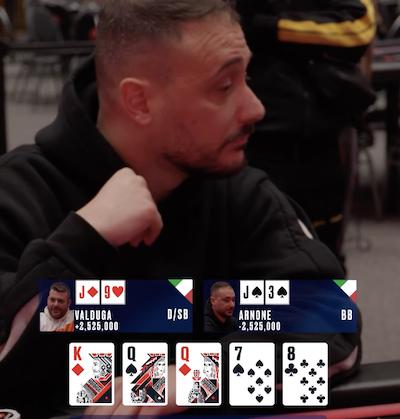 Arrivano le prime tre carte del board, K♦Q♠Q♦, ed entrambi fanno check. L’azione si sposta così al turn, un 7♠ apparentemente innocuo. Arnone decide di prendere l’iniziativa puntando 400.000 chip ma Valduga, senza pensarci troppo, chiama con solo il gut shot per la scala a incastro. Sente odore di bluff. L’8♣ completa il board. Francesco Arnone mette sul tavolo 1.500.000: in meno di 10 secondi, Manuel Valduga chiama con Jack high! Basito, Arnone è costretto a mostrare il bluff e a consegnare il pot al suo avversario, favorito dal kicker 9!