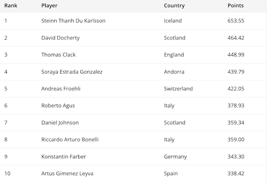 Terzo e ultimo tier è quello dei tornei che hanno una registrazione da €/£/$999 o inferiore. Qui troviamo Steinn Thanh Du Karlsson nel ruolo di capofila. Il player islandese ha raccolto finora 653,55 punti con nove ITM, tre tavoli finali e la vittoria nell’Open Second Chance di Campione (€56.175).