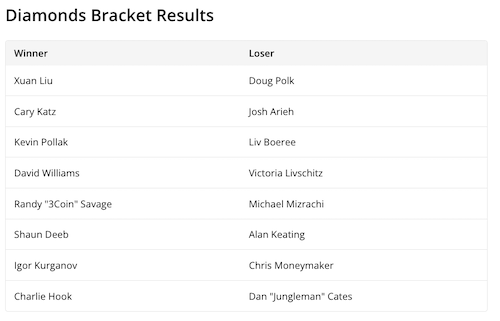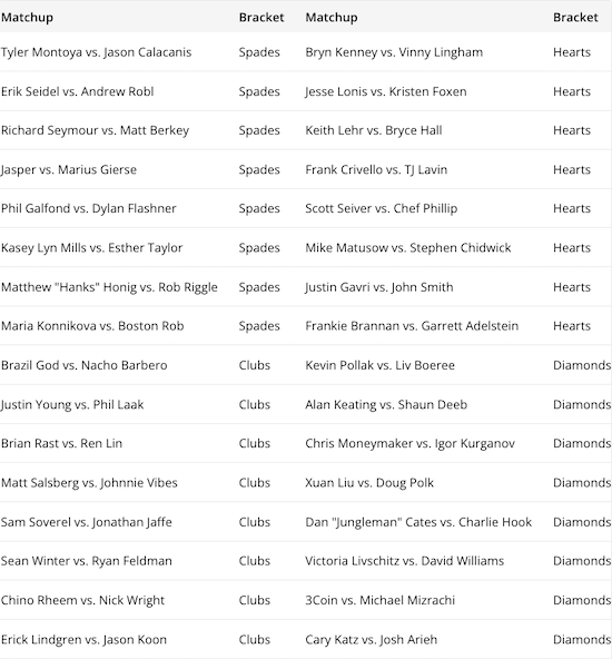 Con 64 partecipanti, tutti giocatori famosissimi (Doug Polk, il campione del mondo in carica Michael Mizrachi, Chris Moneymaker, Liv Boeree, Shaun Deeb, Bryn Kenney, Erik Seidel e tanti altri), Cary Katz e Josh Arieh si sono affrontati nel primo turno del torneo. Questo il tabellone: