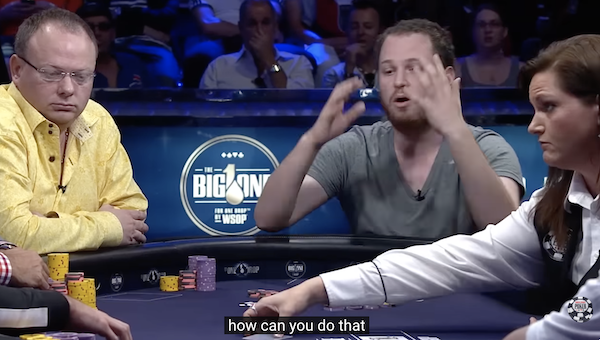 “Come puoi foldare così gli Assi?!” e gira sul tavolo il bluff con K♠10♠. Anche la reazione di Reinkemeier non è male: