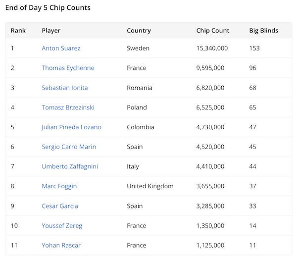 A chiudere in testa al termine del Day 5 è stato lo svedese Anton Suarez, che ha imbustato un impressionante stack da 15.340.000 gettoni, pari a oltre 150 big blind quando si riprenderà a giocare. La sua giornata è stata costellata di eliminazioni. Quella più illustre porta il nome di Tobias Leknes, il noto pro norvegese specialista nei tornei di mixed games.