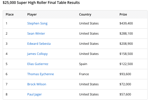 Il torneo, secondo per importanza nel programma del famoso festival pokeristico nordamericano, si è svolto nell’arco di tre giornate, dal 4 al 6 novembre, e ha registrato 60 ingressi da 25mila dollari ognuno. Dato l’alto costo dell’iscrizione, il field è stato arricchito dalla presenza di tanti top players internazionali. Oltre a Song, hanno partecipato al SHR Scott Seiver, Jason Koon, Dan Shak, Daniel Sepiol, Shannon Shorr, Jeremy Ausmus, Sean Winter e Jonathan Little, giusto per citare qualche nome.
