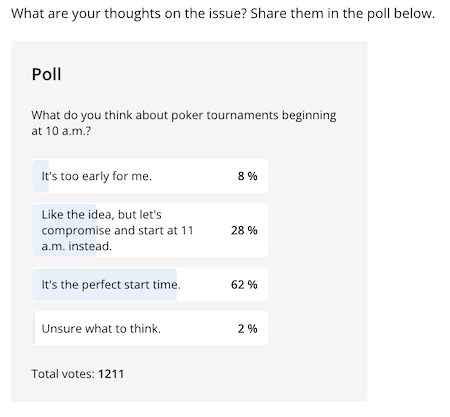 Infine, PokerNews ha avviato un sondaggio tra i propri lettori sulla questione dell’orario dei tornei. Nel momento in cui scriviamo, il 62% è favorevole a iniziare alle 10:00, mentre il 28% preferisce le 11:00. Solo l’8% ritiene che sia troppo presto.