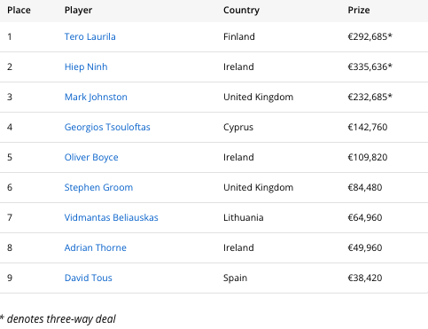 La vittoria di Laurila è stata caratterizzata da un deal con l’irlandese Hiep Ninh (runner-up) e il britannico Mark Johnston (terzo), entrambi giocatori praticamente sconosciuti nell’ambito dei tornei live. Il deal non inficia però la bontà del risultato del finlandese, ottenuto tra l’altro nel più affollato Irish Open ME di sempre, semplicemente ha ridotto il suo payout.