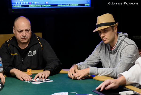 I bui sono 3.000/6.000/500 e il professionista americano, vincitore di tre braccialetti WSOP, due titoli WPT e autore del libro Ace on the River, si trova nelle ultime posizioni del chipcount con uno stack di 120.000 gettoni. A quel punto Daniel Steinberg, un altro player statunitense, apre a 15.000 da utg con 10♥10♦. Greenstein rilancia 45.000 da big blind con A♦A♠.L’azione torna a Steinberg: all-in e call del “Robin Hood of Poker”.